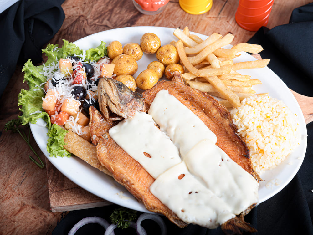 Acompañado de papa salada, papa francesa, arepa, plátano con queso y bocadillo, gaseosa 1.5 Lts.