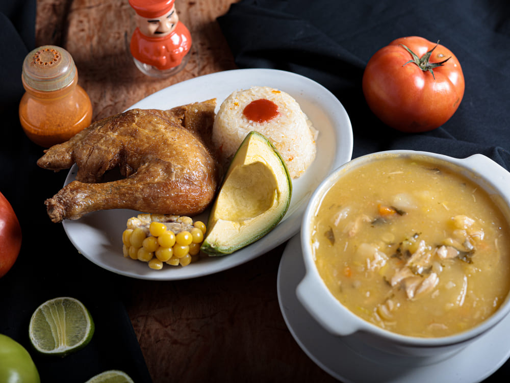 Acompañado de papa francesa, arroz y ensalada, sopa de Ajiaco o